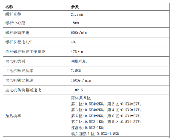 螺杆由整根芯轴和装在其上的多个不同规格并具有良好互换性的螺纹元件,捏合元件组成。螺纹元件牙型曲线经先进的计算机三维造型和辅助设计,保证了螺杆间的全捏合间隙及自清洁性能。螺纹元件,捏合元件与芯轴为渐开线花键联接并由芯轴端部的螺杆头压紧,改变螺纹套、捏合块的规格和在芯轴上的位置,可方便地得到不同的螺杆构型,以适应不同物料和不同工艺的要求。 22mm双螺杆挤出机参数: